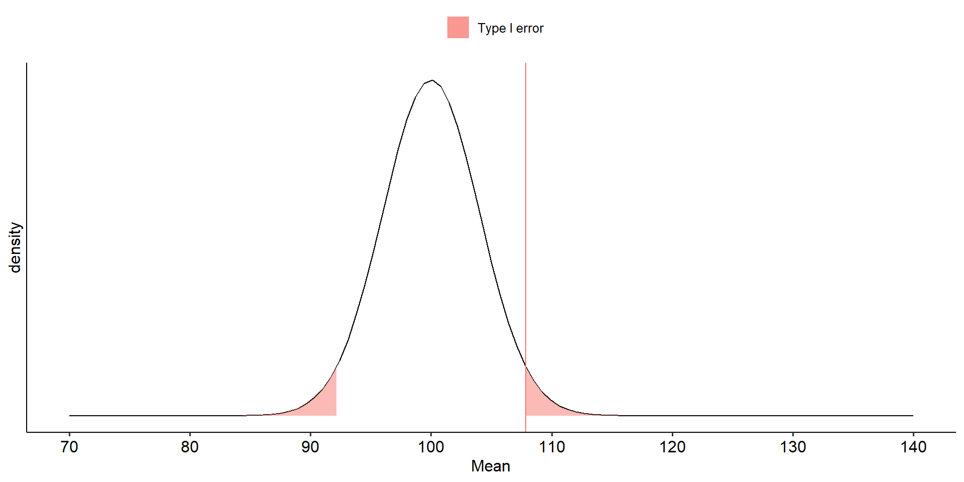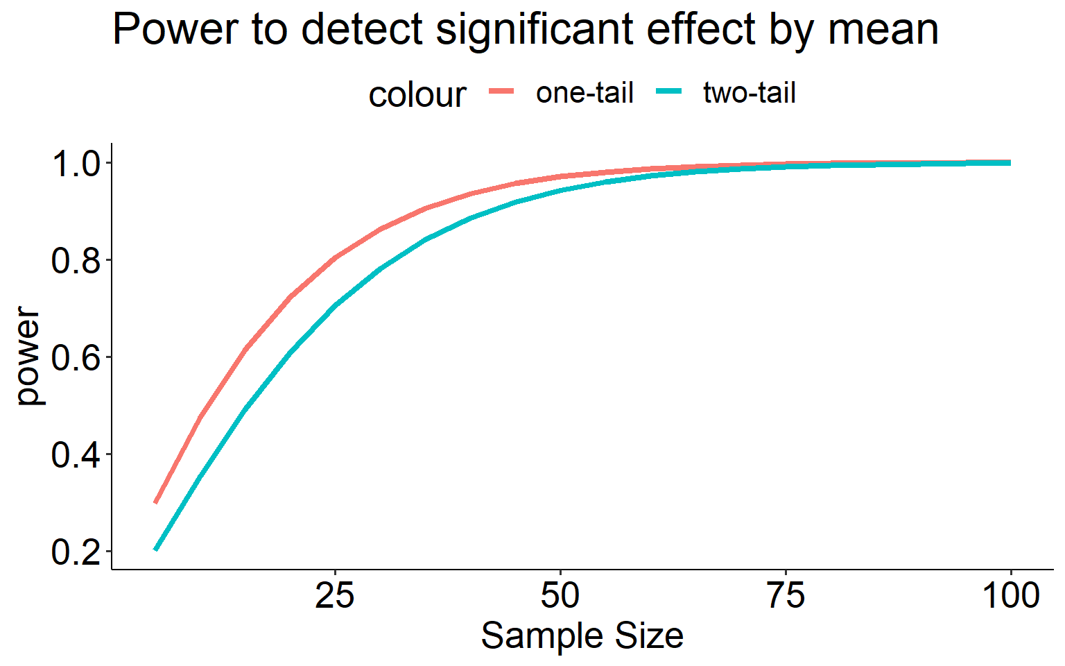 theme(text = element_text(size = 20))A two-tailed test is less powerful (more conservative) than a one-tailed test for the same sample size.