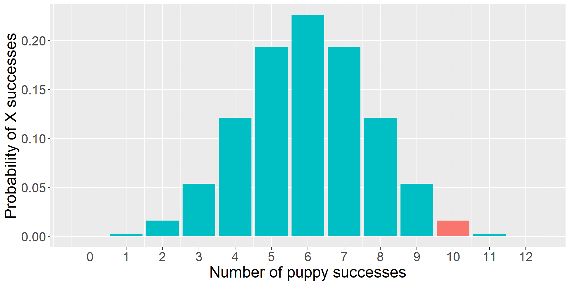 theme(text = element_text(size = 20))The likelihood of the puppy being successful 10 times out of 12 if the true probability of success is .5 is 0.02. That’s pretty low! That’s so low that we might begin to suspect that the true probability is not .5.