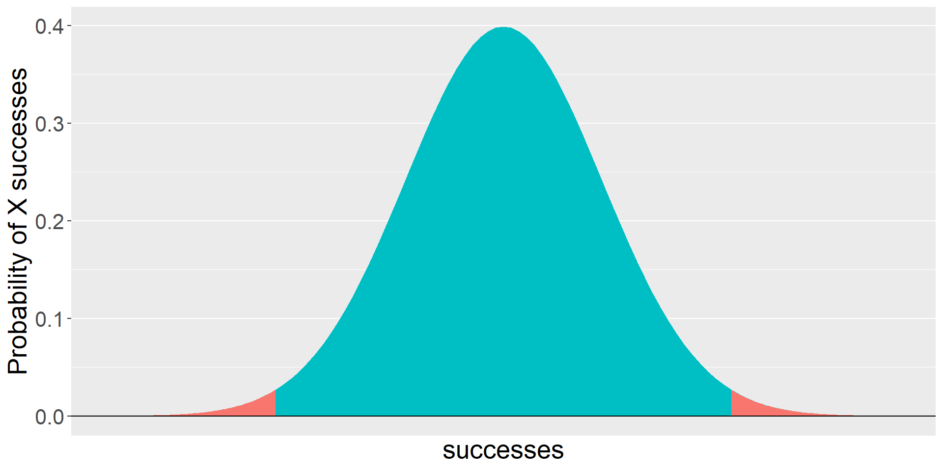 But as we said before, we’re not really going to use the binomial much to make inferences about statistics, because the vast majority of our statistics are continuous, not discrete. Instead, we’ll use other distributions to create our sampling distributions. Sometimes \(t\) , or \(F\) , or \(\chi^2\) .