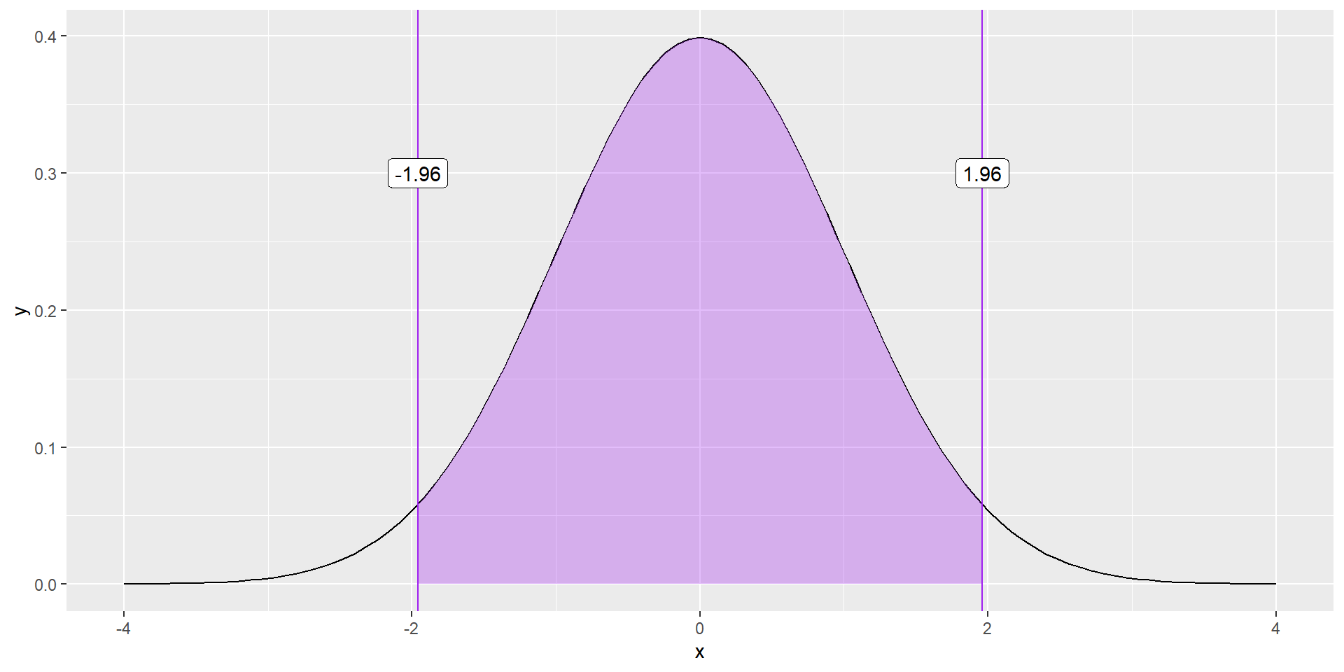 xlim = c(-1.96, 1.96), geom = "area", fill = "purple", alpha = .3) +