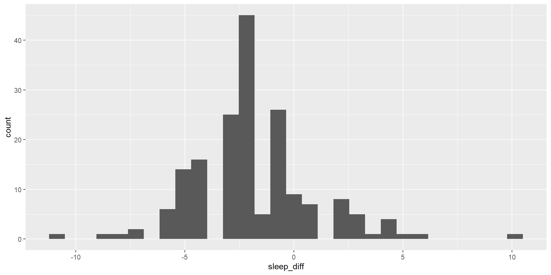 Now we can calculate our \(t\)-statistic: \[t_{df=n-1} = \frac{\bar{D}}{\frac{sd_{diff}}{\sqrt{n}}}\]