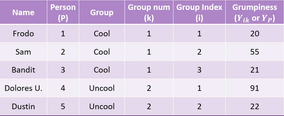 | Name | Grumpiness \(Y_{ik}\) | Group Mean \(\bar{Y_K}\) |