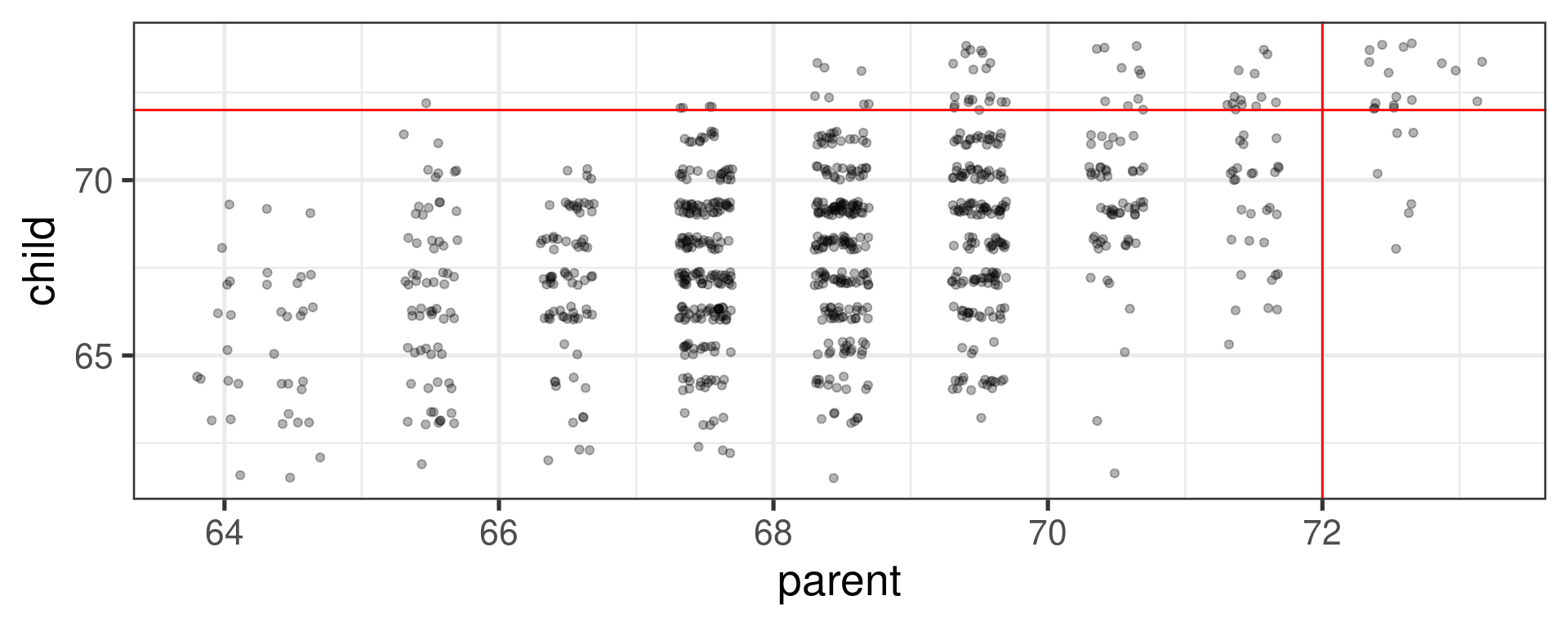 easystatssjPlotAn observation about heights was part of the motivation to develop the regression equation: If you selected a parent who was exceptionally tall (or short), their child was almost always not as tall (or as short).